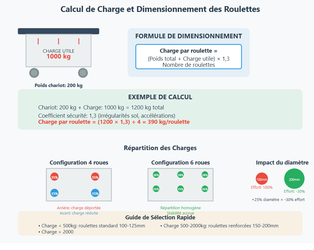 Dans une configuration à 4 roues, la charge théorique représente 25% par roulette, mais la charge réelle atteint souvent 30-35% sur les roues arrière en raison de la charge déportée. Une configuration à 6 roues offre une répartition plus homogène et une stabilité accrue pour les charges importantes.